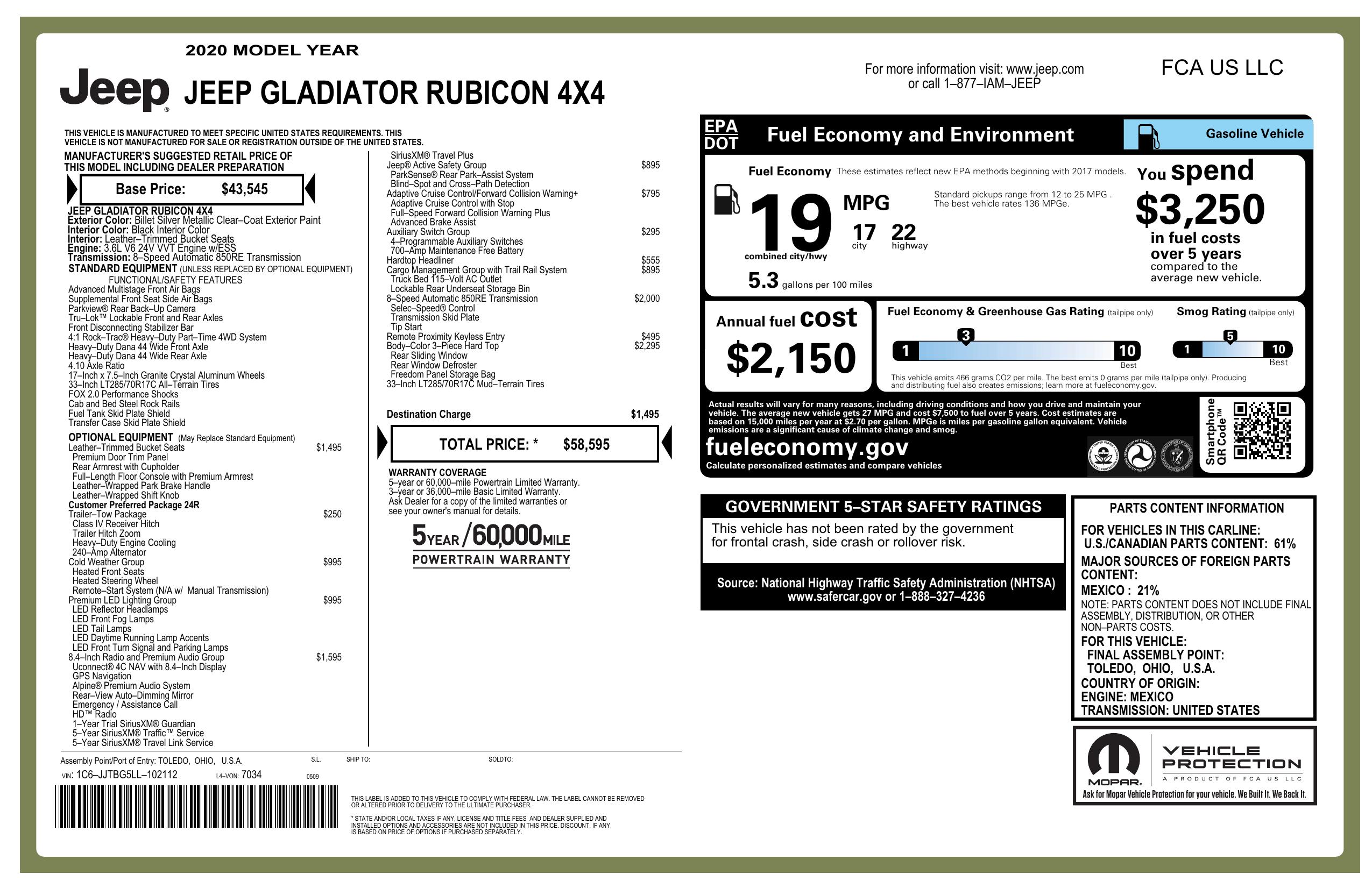 Whether you're heading off-road or cruising through the city streets, this Jeep Gladiator has got you covered. With part-time four-wheel drive, towing equipment, and 7 skid plates, you can take on any adventure with confidence. The Fox HD gas-pressurized shock absorbers and leading link front suspension provide optimal handling and control, making every drive a thrilling experience.